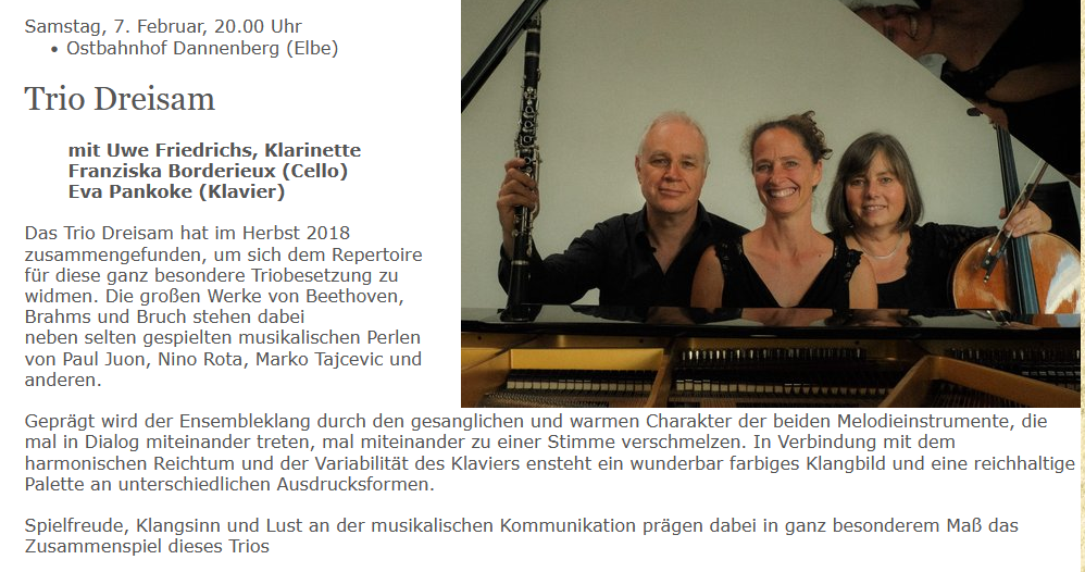 Trio Dreisam am 07.02.2026 um 20:00 Uhr im Bahnhof Dannenberg